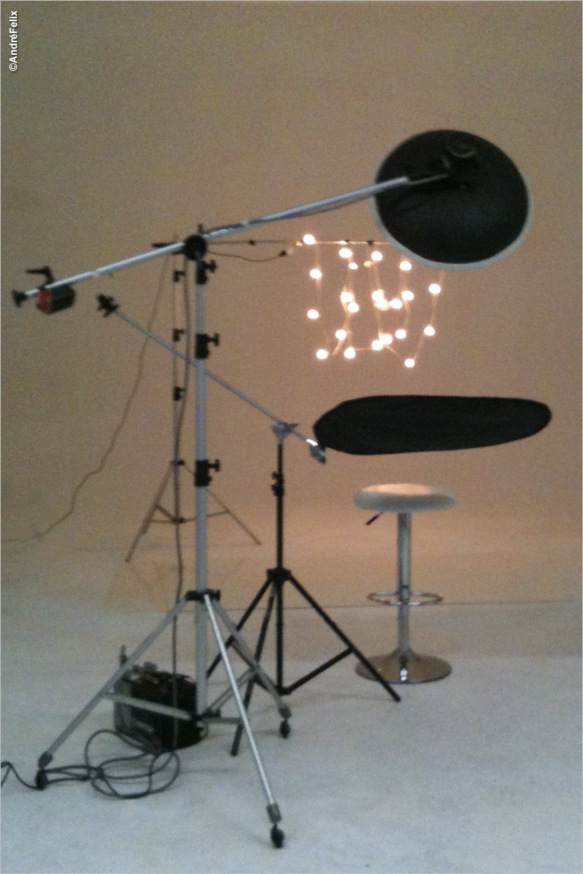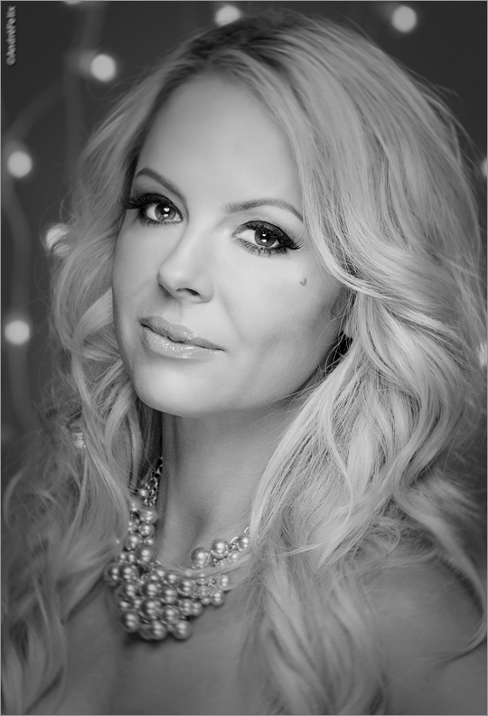 I sometimes place white cards on each side of the model to make a box to bounce the light back around the face. In this shot I did not do that as I wanted the light to drop off as it hit the face with no bounce back. This would give more shaping to the face, the bounce on each side with the white cards can give a flat look. Now to make a background look interesting I use a string of lights which I had & to make sure they would bee seen in the image so I set my ISO at 200. and the exposure was 1.30 sec. (Camera on a tripod) I used a Canon 60D with a lens of 135 mm on a crop sense which gave me a closer look and with F 6.3 I was sure the background lights would be out of focus